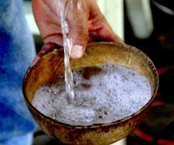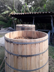 6) FERMENTACIÓN. Después, el producto macerado se deja fermentar con agua en tinas de madera de sabino ( taxodium mucronatum ) de 7 a 15 días, dependiendo de la temperatura ambiente.